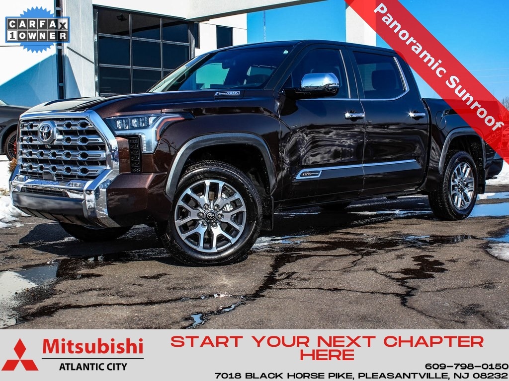 2025 Toyota Tundra Hybrid 1794 Edition CLEAN CARFAX, ONE OWNER, BLUE TOOTH, FULLY RECONDITIONED, NAVIGATION, ALLOY WHEELS, PANORAMIC SUNROOF, LEATHER, Connectivity Kit, Catalytic Converter Shield, Vehicle Protection Package, Tundra Hybrid 1794 Edition, 4D CrewMax, 3.4L V6, 10-Speed Automatic, 4WD, Smoked Mesquite, Saddle Tan w/Premium Leather Seat Trim, 10" Color Head-Up Display (HUD), 12 Speakers, 1794 Grade Package, 4-Wheel Disc Brakes, ABS brakes, Adaptive Cruise Control, AM/FM radio: SiriusXM, Apple CarPlay/Android Auto, Auto High-beam Headlights, Auto-dimming door mirrors, Auto-dimming Rear-View mirror, Automatic temperature control, Bed Extender (TMS), Blind Spot Monitor, Brake assist, Center Console Safe (TMS), Chrome Plated Heated Power Folding Outside Mirrors, Dash Cam (TMS), Dual front impact airbags, Dual front side impact airbags, Electronic Stability Control, Exterior Parking Camera Rear, Front dual zone A/C, Front fog lights, Front wheel independent suspension, Fully automatic headlights, Garage door transmitter: HomeLink, Heated & Ventilated Front Bucket Seats, Heated rear seats, Heated steering wheel, Illuminated entry, Knee airbag, Leather Shift Knob, Leather steering wheel, Low tire pressure warning, Memory seat, Multi-Terrain Back Monitor, Navigation System, Non-Skid Spray-On Bed Liner (TMS), Occupant sensing airbag, Overhead airbag, Panoramic View Back Monitor, Power driver seat, Power passenger seat, Power Running Boards, Premium Leather Seat Trim, Radio: Premium Audio w/JBL, Rear window defroster, Remote keyless entry, Security system, Speed-sensing steering, Steering wheel memory, Telescoping steering wheel, Tilt steering wheel, Traction control, Turn signal indicator mirrors, Ventilated rear seats, Wheel Locks (TMS), Wheels: 20" x 8" Machined-Finish Alloy. Odometer is 3920 miles below market average!